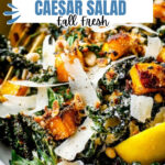 A vibrant Autumn Caesar Salad featuring massaged kale, roasted delicata squash croutons with a savory parmesan-herb crust, toasted nuts, shaved parmesan, and a classic Caesar dressing. This seasonal salad combines sweet roasted squash and hearty kale for a deliciously textured, crowd-pleasing dish perfect for fall meals.