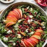 A vibrant Autumn Harvest Honeycrisp Apple and Feta Salad featuring toasted pecans and pumpkin seeds with maple syrup and warming spices, crispy prosciutto, fresh arugula or kale, crunchy apples, creamy avocado, tart pomegranate arils, and tangy feta cheese, all tossed in a flavorful apple vinaigrette infused with fresh herbs. This salad is perfect for a refreshing and festive fall meal or side dish.