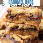 The edges should be lightly golden and set, and the top cookie dough layer should be golden brown. A toothpick inserted into the dough (not the caramel) should come out with only moist crumbs, not raw batter.