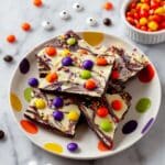 Time for the fun part — sprinkling on your Halloween candies! I’m partial to eyeball sprinkles and those colorful Halloween M&Ms for that pop of color and texture. Press them lightly so they stick in the chocolate but don’t push too hard or you might mess up the swirl. Let your bark set uncovered at room temperature, or pop it in the fridge for about 45 minutes until firm.