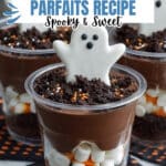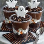 If you find yourself with leftovers (which, honestly, is rare around here), cover the parfaits tightly with plastic wrap and store in the fridge for up to 2 days. I like to wait to add the marshmallow ghosts and extra candy garnish until right before serving again so they stay fresh and don’t get soggy.
