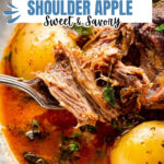 This Braised Pork Shoulder recipe features tender, flavorful pork slow-cooked with aromatic herbs, onions, garlic, apple cider, and granny smith apples. Perfect for a comforting dinner, the dish combines savory and slight sweetness, finished with a rich sauce.