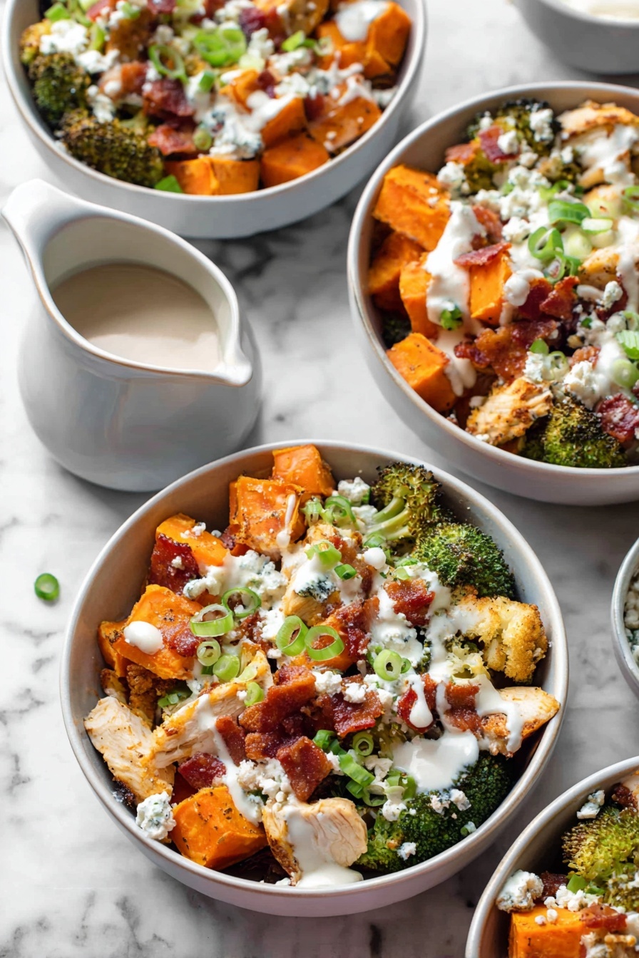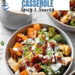 This Buffalo Chicken Sweet Potato Casserole is a flavorful and hearty dish perfect for a family dinner. Combining tender buffalo-spiced chicken, roasted sweet potatoes, and broccoli, topped with melted cheddar cheese, turkey bacon, and green onions, this casserole delivers a spicy and satisfying meal with a creamy ranch finish.