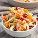 A refreshing and sweet carrot apple salad combining crisp apples, matchstick carrots, tangy cranberries, and creamy vanilla yogurt dressing, perfect for a light side dish or snack.