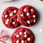 Decadent cheesecake stuffed red velvet cookies featuring a rich cream cheese filling enveloped in a tender, cocoa-infused red velvet dough studded with white chocolate chips. Perfectly soft centers with slightly set edges, these cookies are a delightful treat for any occasion.