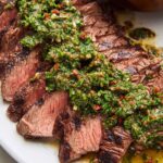 This Chimichurri Flank Steak recipe features a perfectly marinated and seared flank steak topped with a vibrant, fresh chimichurri sauce made from garlic, parsley, cilantro, lemon juice, and avocado oil. The steak is cooked to your preferred doneness on a cast iron skillet and served sliced against the grain with extra chimichurri for a flavorful and satisfying main course.