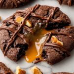 Delight in these rich and indulgent Turtle Cookies featuring a perfect blend of soft caramels, crunchy pecans, and chocolate chips enveloped in a cocoa-infused cookie. Finished with a smooth chocolate drizzle, these cookies are a decadent treat perfect for any occasion.