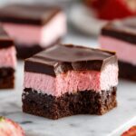 Deliciously fudgy chocolate brownies topped with a vibrant strawberry buttercream and finished with a smooth chocolate glaze, perfect for a decadent dessert treat.