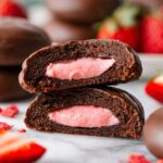 Delight in these luscious Chocolate Covered Strawberry Cookies featuring a rich chocolate cookie exterior with a creamy freeze-dried strawberry butter filling, topped with a smooth chocolate ganache. Perfect for special occasions or an indulgent treat.