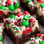 These Christmas Magic Layer Brownie Bars combine rich semi-sweet chocolate brownies with festive toppings including nuts, holiday M&Ms, shredded coconut, sweetened condensed milk, and colorful sprinkles for a deliciously decadent holiday treat perfect for sharing.