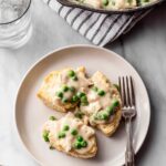 This comforting Creamed Chicken Over Biscuits recipe features tender chicken in a rich, creamy sauce with peas and tarragon, served over flaky homemade country biscuits. Perfect for a cozy family dinner or brunch.