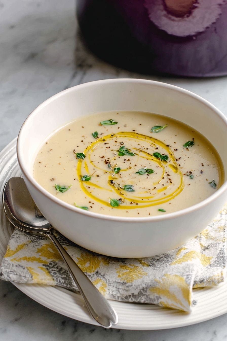 I always finish with a drizzle of good quality olive oil, a sprinkle of freshly ground black pepper, and a few fresh thyme leaves on top — the herb adds a subtle brightness that cuts through the richness beautifully. Sometimes I add a little crouton crunch or crispy pancetta if I’m feeling indulgent. Garnishes turn this humble soup into something special and inviting.