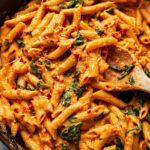- Add Pasta and Seasonings: Add 8 ounces of dry penne pasta, 1 cup of marinara sauce, 2 cups of water, 1/2 teaspoon garlic powder, 1/2 teaspoon dried oregano, and 1/2 teaspoon each of kosher salt and cracked black pepper to the skillet. Increase the heat to medium-high and bring the mixture to a simmer.