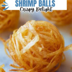 Crispy and flavorful fried shrimp balls coated with crunchy spring roll wrapper strips, perfect as a delicious appetizer or snack served with Thai sweet chili sauce.