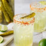 I’m a huge fan of the classic pickle spear garnish because it embodies the spirit of the cocktail, but you could also add a thin lime wheel or even a small sprig of dill if you want to dress it up a bit. The rimmed Tajín really brings that extra pop of flavor, so don’t skip it!