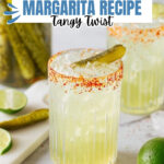 - Strain and Serve: Strain the margarita into your prepared glass with the Tajín rim and pickle spear garnish. Serve immediately.