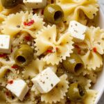 - Combine the salad: In a large mixing bowl, add the cooled pasta, roughly chopped green olives, and feta cheese cubes or blue cheese crumbles. Pour the dressing over the salad and toss gently until everything is evenly coated.