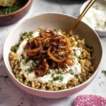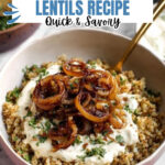 - Combine and Serve: Mix about two-thirds of caramelized onions into the lentils and rice. Reserve the remaining onions for garnish. Serve in bowls topped with dairy-free yogurt, reserved onions, and fresh herbs like parsley or cilantro. Enjoy!