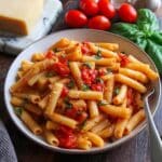 Leftover pasta is best stored in an airtight container in the fridge and eaten within 2 days. Because the sauce is fresh tomato-based without heavy cream, it holds up well but may thicken slightly; just add a splash of olive oil or water when reheating to bring it back to life.