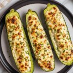 Delicious and creamy feta cheese stuffed zucchinis baked to perfection with a blend of Greek yogurt, Gruyere cheese, herbs, and subtle seasoning for a savory vegetarian dish that can be served warm or cold.