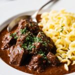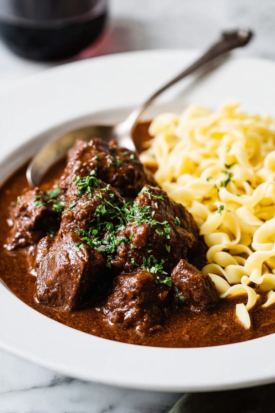 Once the beef is tender and the sauce has thickened to your liking, remove the bay leaf and sprinkle fresh chopped parsley over the top. It adds a fresh pop of color and flavor that brightens the warm, hearty dish. Serve immediately with your favorite sides like spaetzle, buttered noodles, or creamy mashed potatoes for the ultimate, satisfying meal.