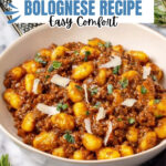 A hearty and comforting Gnocchi Bolognese recipe featuring tender potato gnocchi served with a rich and flavorful beef and tomato sauce infused with fresh herbs and a hint of spice, perfect for a satisfying Italian main course.