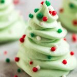 These Christmas Meringues are light, airy, and beautifully shaped like festive trees, perfect for holiday celebrations. Made from just egg whites and sugar, with a touch of cream of tartar for stability, these crisp treats are colored green and topped with sprinkles for a charming seasonal touch.