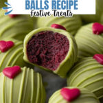 Delightfully festive Grinch Oreo Balls made with red velvet Oreos, creamy filling, and coated in vibrant green candy melts. Finished with red heart sprinkles, these no-bake truffles are a perfect sweet treat for the holiday season or any fun occasion.