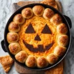 This Halloween Pizza Dip is a fun and spooky appetizer perfect for Halloween parties. It combines a creamy, cheesy chicken dip with a pizza dough crust shaped like a monster face, filled with cheddar cheese-stuffed dough balls baked until golden and bubbly.