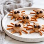 These spiders are best served chilled or at room temperature. If they’ve stiffened up in the fridge, just let them sit out for 10 minutes to soften slightly before serving. Avoid microwaving, as the pretzel legs will get limp and the peanut butter texture can get oily and less appetizing.