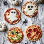 Get creative with toppings! Use bell peppers cut into triangles or strips for mouths and fangs, olives for eyes, sliced onions for witches’ hats, and pepperoni to make spooky shapes. You can even use small cookie cutters to shape cheese slices. The key is to have fun and not worry about being perfect.