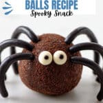 Create spooky Halloween Spider Energy Balls using chocolate energy balls, candy eyeballs, and licorice or fruit leather legs. These fun and easy no-bake treats are perfect for Halloween parties and snacks.