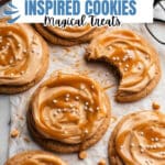 Spread a generous dollop of buttercream on each cookie using a mini offset spatula. Drizzle with your homemade butterbeer caramel and sprinkle your favorite festive sprinkles if you like a little sparkle! Now, grab a butterbeer or pumpkin latte and enjoy the magic.