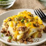 Absolutely! If you’re short on time or want to skip slicing potatoes, frozen shredded hashbrowns are a great swap. Use about 3 pounds (48 ounces), spread them evenly in the dish, and proceed with layering the beef and sauce. Just keep in mind the texture will be a bit softer but still delicious.