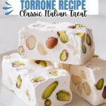 Traditional Italian Torrone is a soft white nougat made with honey, sugar, egg whites, and toasted nuts. This chewy, sweet treat is flavored with vanilla or citrus zest and perfect for festive occasions or as a delightful dessert.