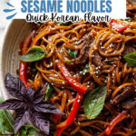 A quick and flavorful 20-minute Korean Beef Sesame Noodles recipe featuring tender flank steak, mixed stir fry vegetables, and a savory, spicy sauce made with garlic, ginger, tamari, honey, rice vinegar, and Gochujang. Perfect for an easy dinner packed with bold Korean flavors.