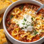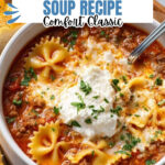 This hearty Lasagna Soup combines the rich flavors of classic lasagna with the comforting warmth of a soup. Featuring ground beef, diced tomatoes, tomato sauce, and bowtie pasta, it’s topped with creamy ricotta, shredded mozzarella, parmesan cheese, and fresh parsley for a delicious and satisfying meal perfect for any day.