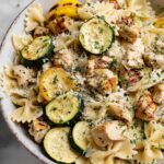 A bright and flavorful Lemon Chicken Pasta featuring tender chicken breasts, fresh zucchini and yellow squash, tossed with mini farfalle pasta in a buttery lemon sauce, finished with freshly grated parmesan and parsley for a delicious weeknight meal.
