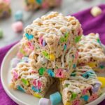 Delight in these sweet and colorful Lucky Charms Treats made with melted butter, gooey marshmallows, and crunchy Lucky Charms cereal. Easy to make and perfect for a fun snack or dessert, this recipe can also be enhanced with a drizzle of white chocolate on top for extra indulgence.