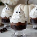 Mini Ghost Trifles are a fun and festive Halloween dessert featuring layers of moist chocolate cake and fluffy whipped cream, topped with monster eye sprinkles to create an adorable ghostly effect. This easy no-fuss recipe is perfect for Halloween parties and can be made using homemade or boxed chocolate cake.