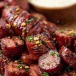 These Mustard Hasselback Kielbasa Bites are flavorful, bite-sized sausage pieces sliced just right to hold a tangy mustard glaze, air fried to golden perfection, and served with a creamy mayonnaise dipping sauce garnished with fresh parsley. Perfect as an appetizer or snack for any occasion.