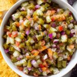This Pickle de Gallo is a tangy, crunchy twist on traditional salsa, combining diced dill pickles, cucumber, Roma tomato, red onion, and jalapeno with garlic powder, dried dill, and pickle juice for a flavorful and refreshing dip perfect for serving with tortilla chips or as a topping on fajitas.