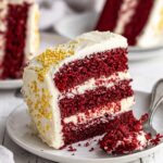 I often finish this cake with a simple garnish of red velvet crumbs from trimming the cakes, which gives a rustic, bakery-style look. Sometimes I add fresh strawberries or a sprinkle of toasted pecans for a little crunch and freshness that pairs beautifully with the rich frosting.