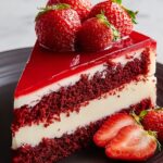 A decadent layered dessert featuring a moist red velvet cake base topped with a creamy cheesecake layer, finished with a luscious strawberry preserve topping and fresh strawberries for a perfect balance of flavors and textures.