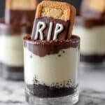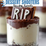 RIP Halloween Dessert Shooters are a spooky and delicious treat featuring creamy pudding topped with Oreo cookie crumbs and chocolate-coated ladyfinger gravestones decorated with royal icing. Perfect for Halloween parties or themed gatherings.