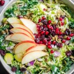 A refreshing and crisp shaved Brussels sprout salad featuring kale, dried cranberries, apple slices, pomegranate seeds, and sunflower seeds, all tossed in a tangy maple Dijon vinaigrette. Perfect as a light, healthy side or a vibrant appetizer.
