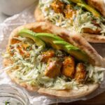 - Assemble the pitas: Stuff each pita with a generous amount of herby ranch slaw, caramelized chicken pieces, and cubed ripe avocado. Serve immediately.