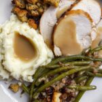 To bring leftovers back to life, I usually reheat the stuffing covered with foil at 350°F until warmed through to prevent drying out. The turkey slices do great with a quick sear in a pan or 350°F oven wrapped in foil with a splash of chicken broth to keep them juicy.