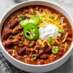 - Serve with toppings: Once cooked, serve the chili hot with your favorite toppings such as shredded cheddar cheese, sliced green onions, chopped red onion, sliced jalapeno peppers, and a dollop of sour cream if desired.