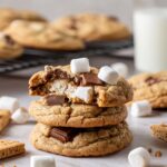 Delight in the nostalgic flavors of campfire s’mores transformed into soft, chewy cookies loaded with mini marshmallows, graham cracker pieces, and rich chocolate chips, topped with toasted marshmallows and chunks of Hershey’s chocolate for an irresistible treat.